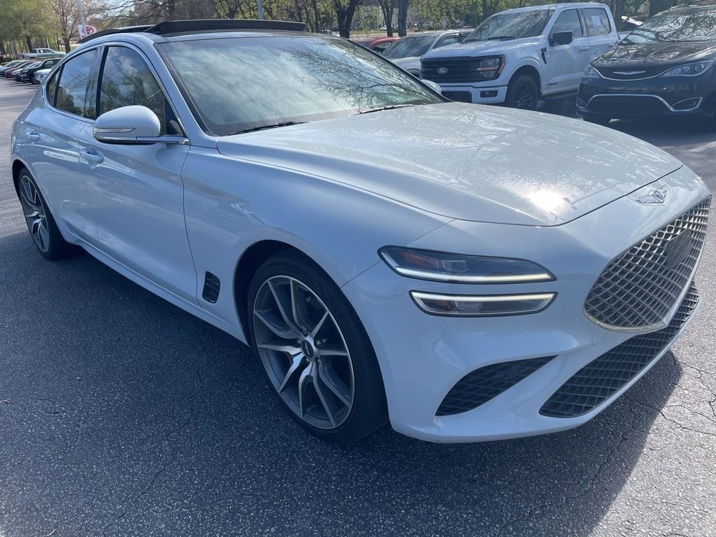 Makalu Gray 2022 Genesis G70 2.0T RWD 8-Speed Automatic 2.0L Turbocharged LOCAL TRADE IN, BACK OF CAMERA, LEATHER, HEATED SEATS, COOLES SEATS, SUNROOF, NAVIGATION, SMART KEY W PUSH BUTTON START, LANE DEPARTURE ALERT W STEERING ASSIST, APPLE CARPLAY & ANDROID AUTO, NO ACCIDENTS, MUST SEE!, ABS brakes, Air Conditioning, Android Auto & Apple CarPlay, Anti-whiplash front head restraints, Auto High-beam Headlights, Electronic Stability Control, Exterior Parking Camera Rear, Four wheel independent suspension, Front Bucket Seats, Front dual zone A/C, Fully automatic headlights, Heated front seats, Leatherette Seating Surfaces, Navigation System, Option Group 02, Power driver seat, Power steering, Power windows, Prestige Package, Radio: AM/FM/SiriusXM/HD Audio System, Rear seat center armrest, Rear window defroster, Remote keyless entry, Steering wheel mounted audio controls, Telescoping steering wheel, Traction control, Turn signal indicator mirrors, Wheels: 18 x 8.0J Alloy, Wide Sunroof.