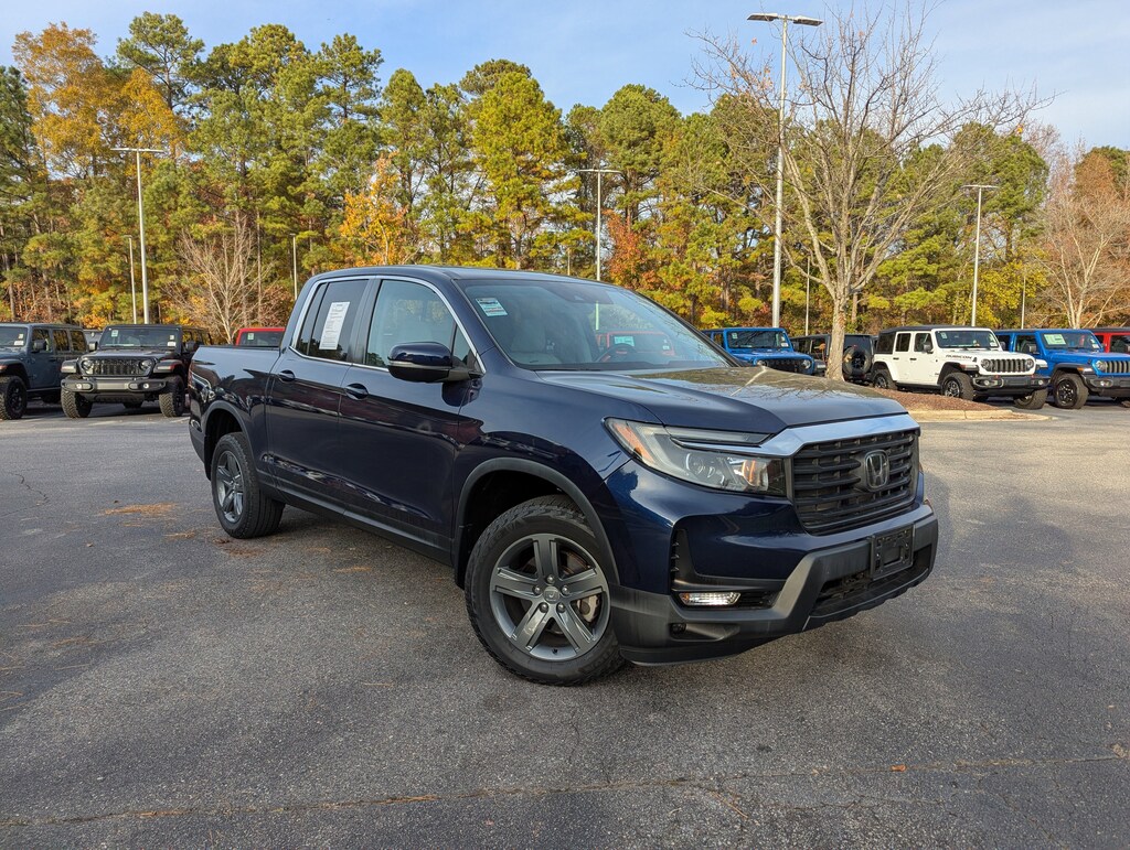 Clean CARFAX. CARFAX One-Owner. Obsidian Blue Pearl 2023 Honda Ridgeline RTL AWD 9-Speed Automatic 3.5L V6 SOHC i-VTEC 24V 4-Wheel Disc Brakes, 4.33 Axle Ratio, 7 Speakers, ABS brakes, Air Conditioning, Alloy wheels, AM/FM radio: SiriusXM, Apple CarPlay/Android Auto, Auto-dimming Rear-View mirror, Automatic temperature control, Blind Spot Information (BSI) System warning, Bluetooth® Hands-Free Link, Brake assist, Bumpers: body-color, Delay-off headlights, Driver's Seat Mounted Armrest, Dual front impact airbags, Dual front side impact airbags, Electronic Stability Control, Exterior Parking Camera Rear, Four wheel independent suspension, Front anti-roll bar, Front Bucket Seats, Front dual zone A/C, Front fog lights, Fully automatic headlights, Garage door transmitter: HomeLink, Heated door mirrors, Heated Front Bucket Seats, Heated front seats, Illuminated entry, Leather Seat Trim, Low tire pressure warning, Memory seat, Occupant sensing airbag, Outside temperature display, Overhead airbag, Panic alarm, Passenger seat mounted armrest, Power door mirrors, Power driver seat, Power moonroof, Power passenger seat, Power steering, Power windows, Radio data system, Radio: 215-Watt Audio System w/7 Speakers, Rear air conditioning, Rear anti-roll bar, Rear reading lights, Rear seat center armrest, Rear step bumper, Rear window defroster, Remote keyless entry, Security system, SiriusXM, Speed control, Speed-sensing steering, Split folding rear seat, Steering wheel mounted audio controls, Tachometer, Telescoping steering wheel, Tilt steering wheel, Traction control, Trip computer, Turn signal indicator mirrors, Variably intermittent wipers, Wheels: 18" Exclusive Pewter Gray Alloy.